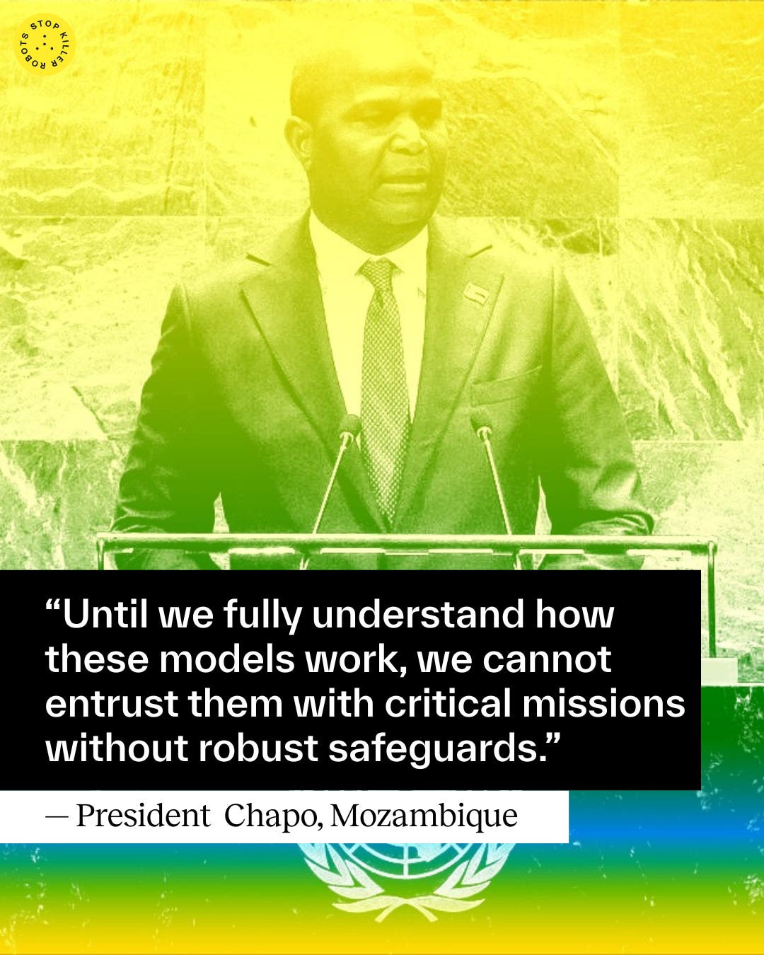 Mozambique’s statement demonstrates the general regional position of their region — legal safeguards on autonomous are needed now. Indeed many states in the global south, where are autonomous weapons are more likely to be used than produced, have taken a similar position on the urgency of regulation. With 129 of the 193 states at the UN, agreeing that there should be a legally binding treaty on autonomous weapons, it’s clear that there is desire to make an autonomous weapons treaty a reality.