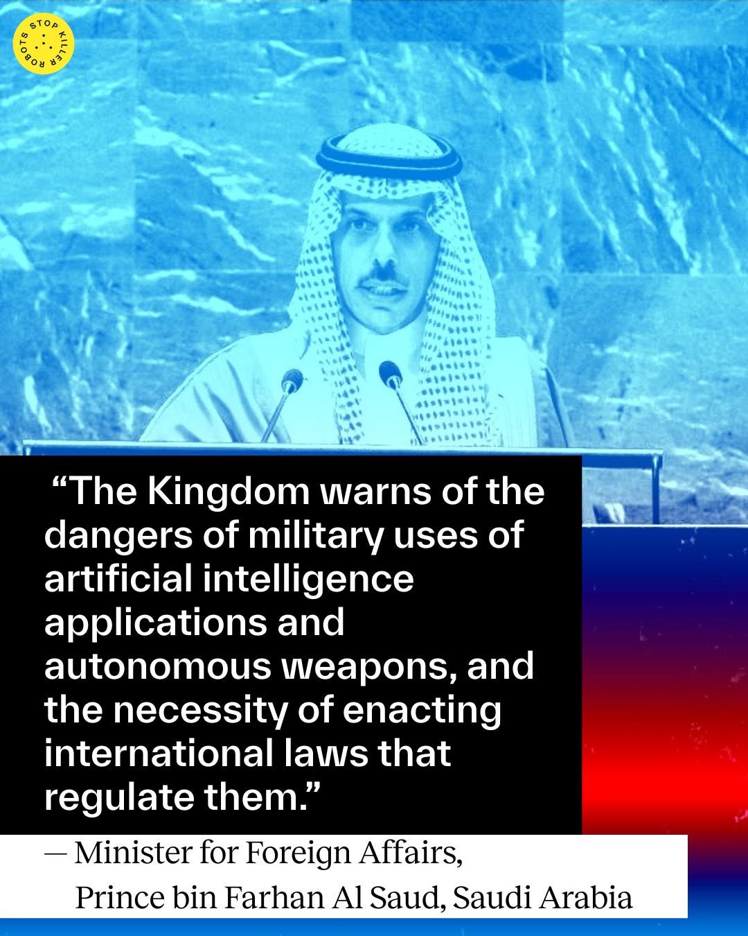 9. Minister for Foreign Affairs, Prince Faisal bin Farhan Al Saud: “The Kingdom warns of the dangers of military uses of artificial intelligence applications and autonomous weapons.“
