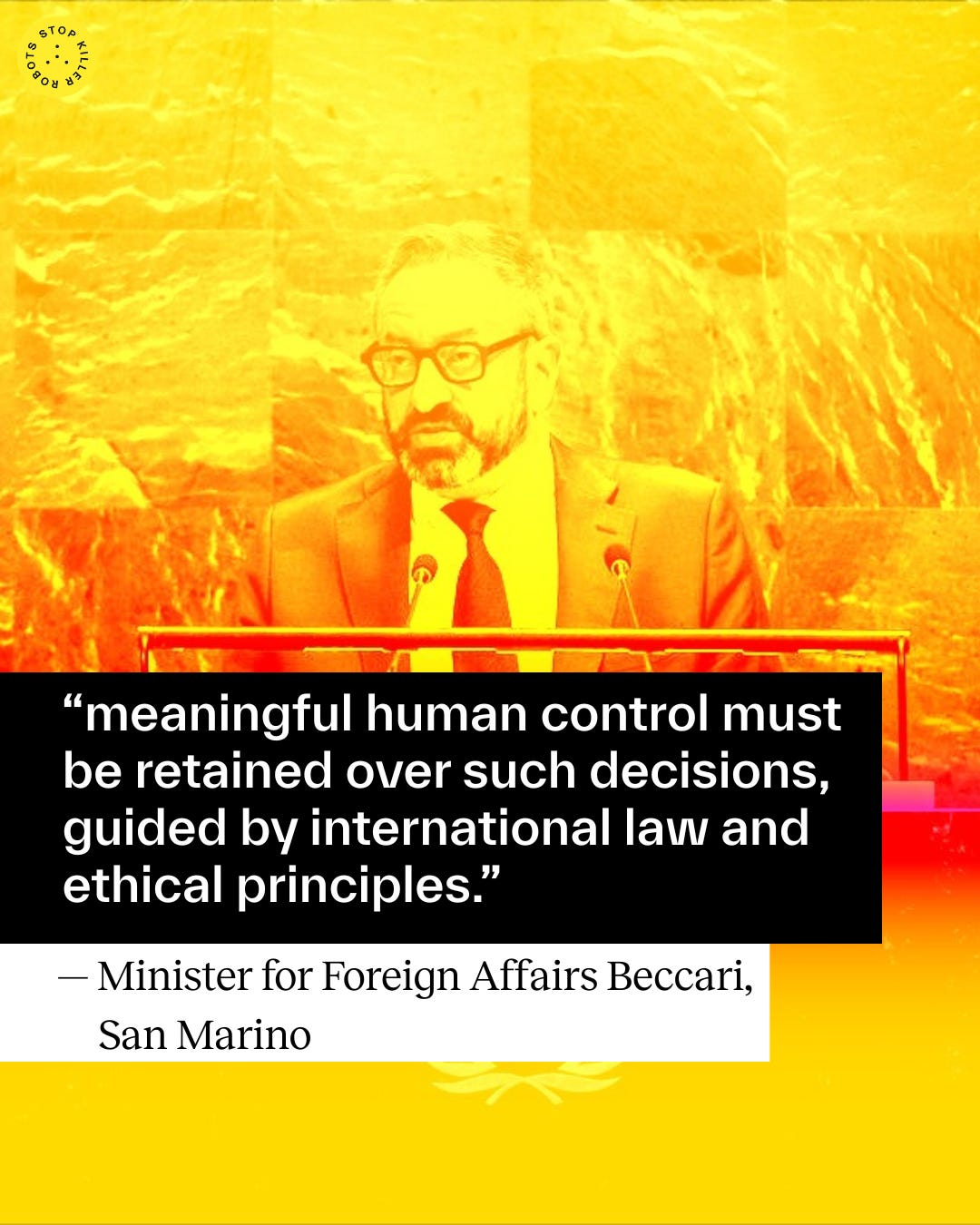 “We are worried about the risks related to new technologies in the military domain. The rapid advances in artificial intelligence have led to concerning levels of autonomy in conflicts. Artificial Intelligence has been used in conflicts to select targets and make decisions over life or death. San Marino believes that meaningful human control must be retained over such decisions, guided by international law and ethical principles.”