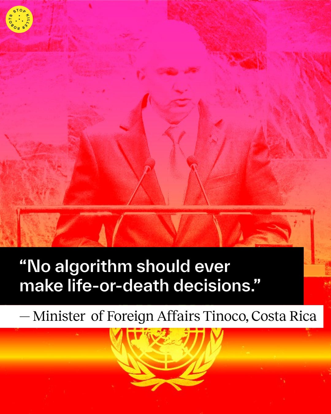 “One application of AI that deserves special attention is autonomous weapons systems. Costa Rica urges the conclusion, before 2026, of a legally binding instrument that establishes prohibitions and regulations for autonomous weapons systems capable of identifying, selecting, and attacking targets without meaningful human control. No algorithm should ever make life-or-death decisions.”
