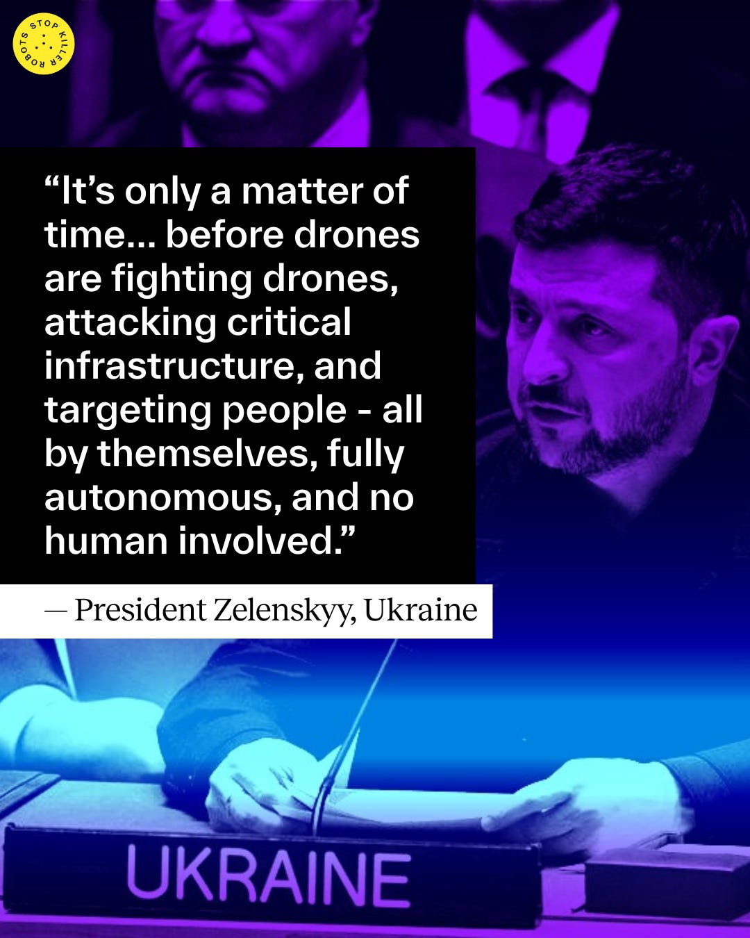 “…it’s only a matter of time - not much - before drones are fighting drones, attacking critical infrastructure, and targeting people - all by themselves, fully autonomous, and no human involved - except the few who control AI systems.”