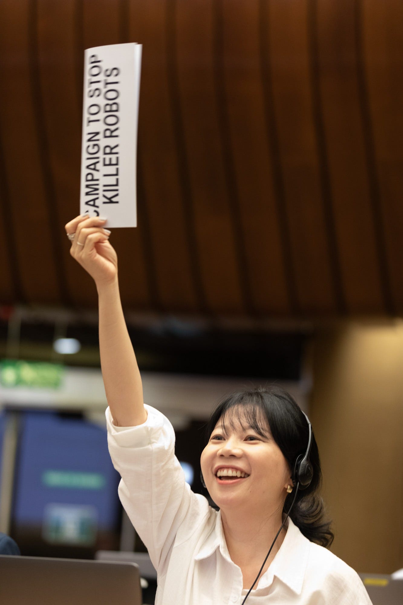At the GGE, states continued their discussion of the rolling text developed by the Chair of the meeting Dutch Ambassador Robert in den Bosch in 2024. This rolling text contains the elements of what a potential instrument on autonomous weapons, what we refer to as killer robots, could contain. Basically, this rolling text is what states would use as the basis of negotiations of new international law on autonomous weapons — the thing we’ve been advocating for since our campaign was founded in 2012.